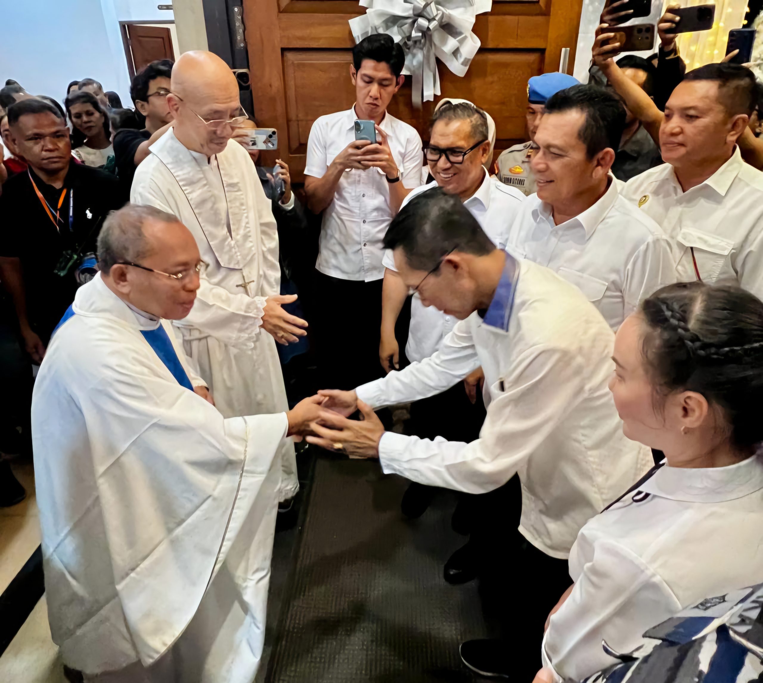“kami hanya bisa bersalaman dan berjabat-tangan, karena kondisi Gereja sudah sumpek dan umat sudah berdesakan, tak ada lagi ruang kosong. Gubernur dan Pejabat lain juga tidak terlalu lama berada di Gereja,” ungkap Romo Mukin (vsh)