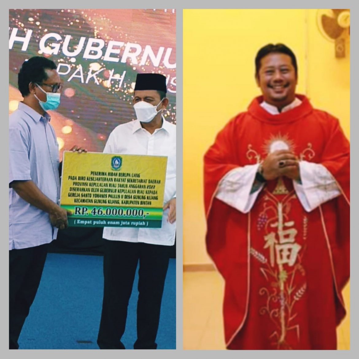 Lebih lanjut Romo yang pernah berkecimpung di Komsos Papin ini meceritakan tentang foto itu. “Setelah berjuang dan mendapatkan rekomendasi masyarakat sekitar, FKUB dan Kementerian Agama, maka Pemerintah Propinsi juga memberi apresiasi berupa dana hibah,” ungkap Romo Parokus HSMTB Tanjungpinang ini.