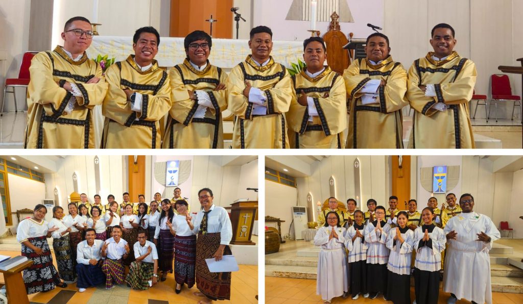 Perayaan Ekaristi semakin semarak dengan iringan koor paroki yang tampil harmonis dan penuh penghayatan. Balutan busana putih dipadu kain Flores menghadirkan nuansa khas yang indah, sementara lagu-lagu yang dinyanyikan berhasil mengantar umat masuk dalam suasana doa yang khusyuk dan mendalam.