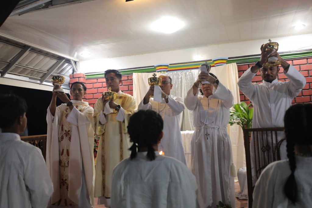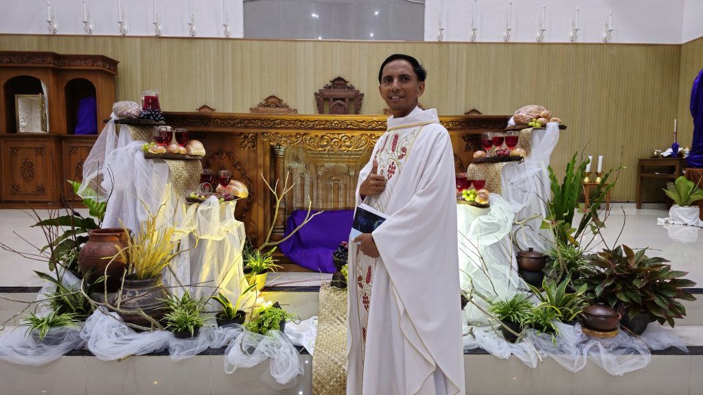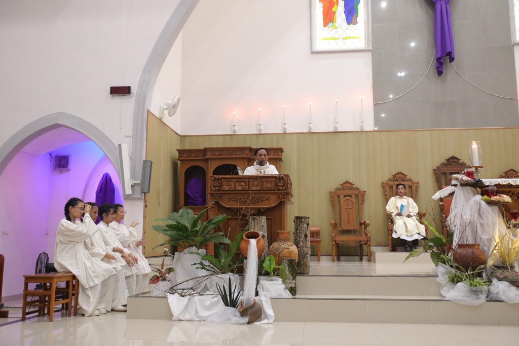 Suasana perayaan terasa khidmat sejak awal. Di depan altar, roti dan buah anggur, lengkap dengan gelas berisi anggur, ditata secara khusus. Tata simbolik ini menegaskan makna Perjamuan Malam Terakhir, saat Yesus menyerahkan diri-Nya bagi keselamatan manusia.