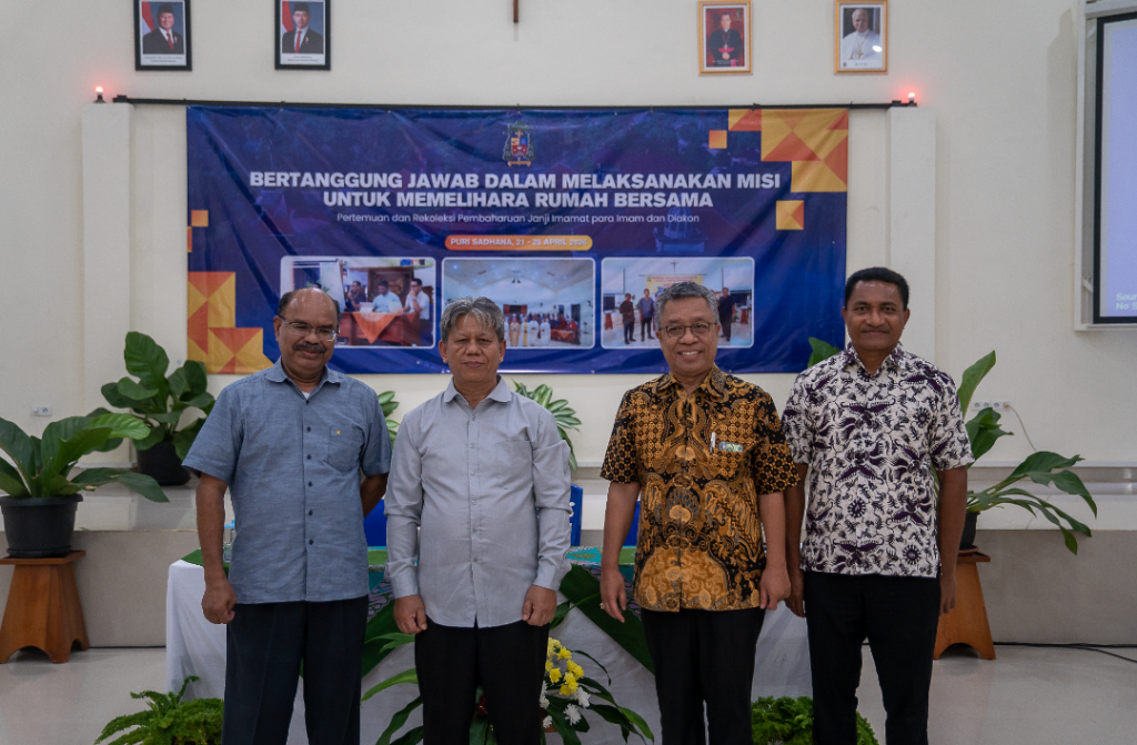 Dr. Ir. Ismed Inonu, M.Si., bersama Bapa Uskup Adrianus, Romo Vikjen dan Romo Samuel sebagai Moderator