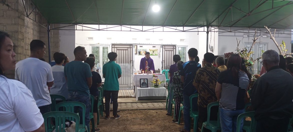 Mentok, BerkatNews.com – Rumah Ibu Maria Susanti dipenuhi oleh sekitar 80 umat yang berkumpul untuk mengikuti Misa Peringatan Arwah, Kamis (31/10). Misa ini didedikasikan untuk mengenang dua almarhum, yaitu Adrianus Erros dan Thomas Radiyo. Misa ini dipimpin oleh Romo Raymond yang membawa pesan peneguhan dalam homilinya.