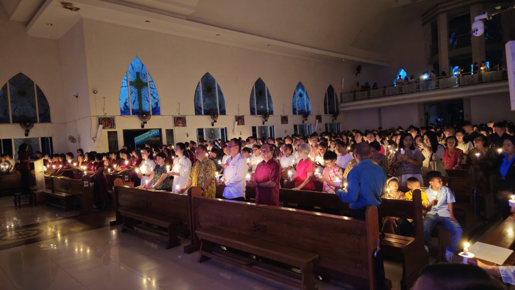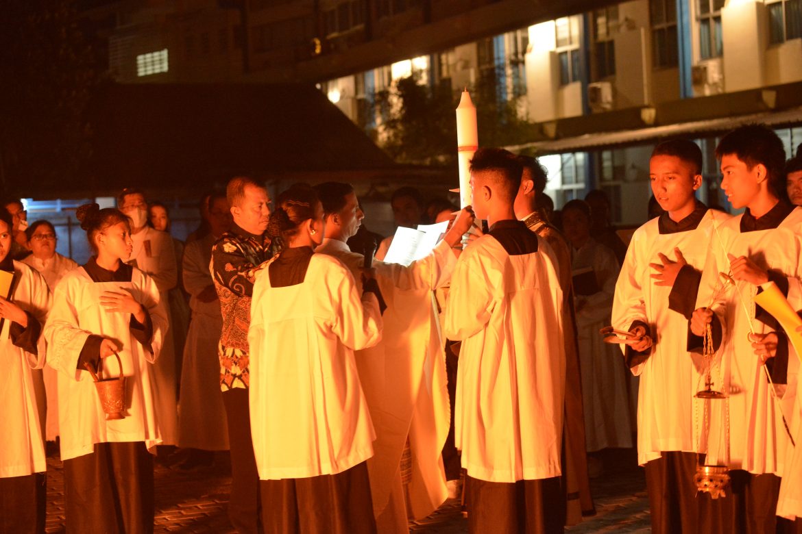 Dalam keadaan lampu gereja dipadamkan, cahaya lilin perlahan menerangi seluruh ruang, menjadi simbol terang kebangkitan Kristus di tengah kegelapan.