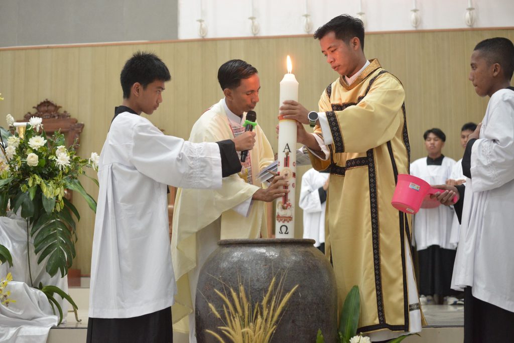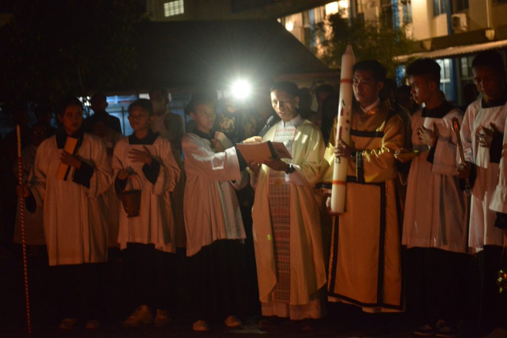 Perayaan diawali dengan upacara cahaya, Lilin Paskah dinyalakan dan diarak masuk ke dalam gereja, disertai tiga kali seruan “Kristus Cahaya Dunia”. Dari satu nyala lilin itu, api kemudian dibagikan kepada lilin-lilin umat.