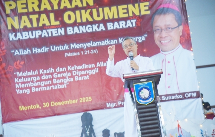Demikian intisari kotbah Uskup Pangkalpinang Mgr. Prof. Adrianus Sunarko, OFM saat menyampaikan renungan pada perayaan natal oikumene se- Kabupaten Bangka Barat di Mentok, Selasa (30/12/2025) malam.